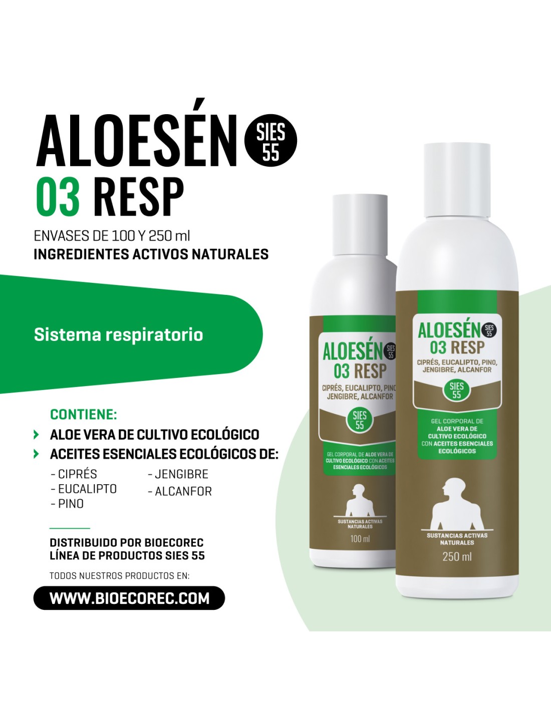Aloesen 03 RESP es un gel de aplicación tópica procedente de Aloe Vera ecológico extra (más de 5 años) procesado en frío para que no pierda sus propiedades, conteniendo gran cantidad de principios activos, sales orgánicas, vitaminas, enzimas y aminoácidos. Posee un gran poder hidratante, regenerador y estimulante de la síntesis de proteínas, del colágeno y de la elastina. Se le han añadido una variedad de aceites esenciales también ecológicos, específicos y exclusivos, que gracias al poder saponificador del Aloe vera (favorece la penetración en la piel de las sustancias añadidas) se consiguen unos resultados rápidos y efectivos gracias a la sinergia de todos sus componentes.